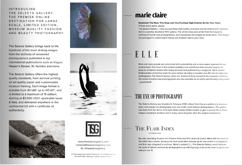 Founded in 2018 by Marie Audier D'Alessandris, The Selects Gallery is the premier online destination for limited-edition, large-scale fine fashion photography. The gallery offers exclusive access to iconic images from the archives of renowned fashion and beauty photographers like Terry O’Neill, Norman Parkinson, and Rose Hartman. whose work has graced elite publications such as Vogue and Harper’s Bazaar.